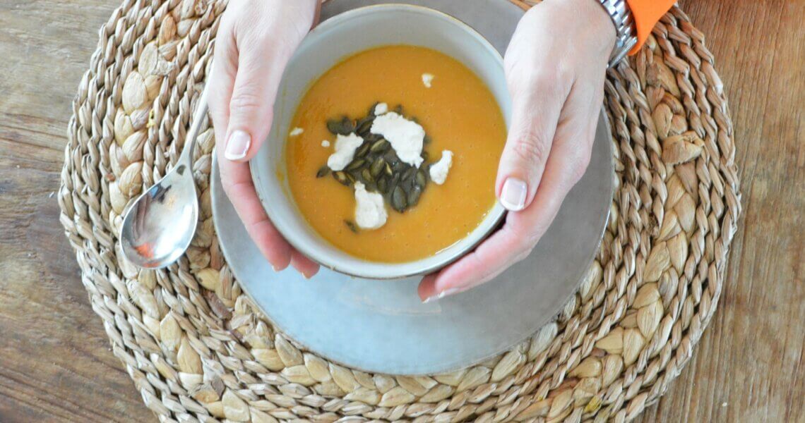 Doe bij het opdienen een stukje geitenkaas in de soep en voeg wat pompoenpitten toe. Je kan deze pompoenpitten ook roosteren , zie het recept op de site, je hebt dan gelijk een gezonde snack voor later. Eet smakelijk!!